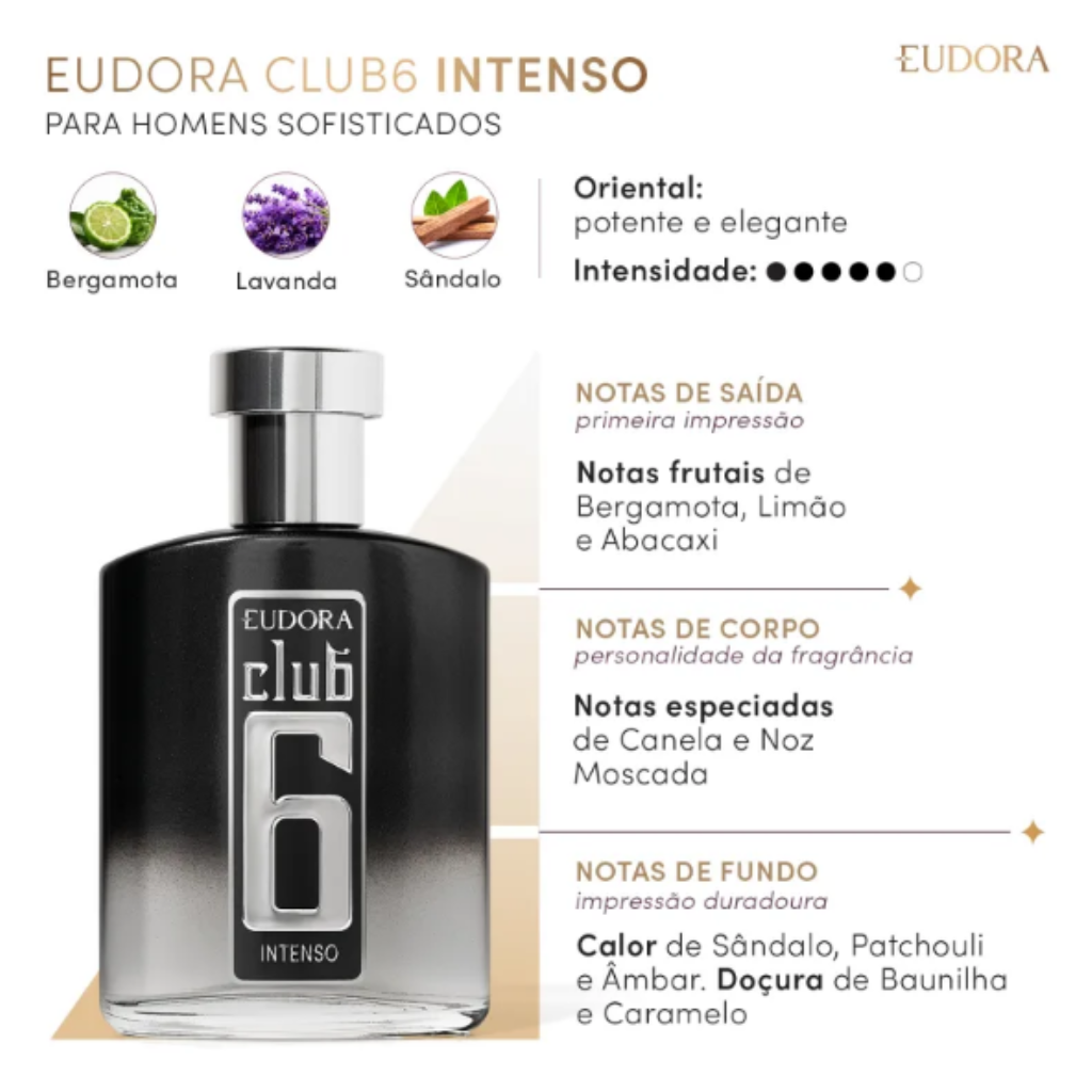 Com uma embalagem de vidro com nuances de transparência e grafite com acabamento metalizado, Club 6 Intenso Eudora entrega estilo único da embalagem até a última gota de fragrância intensa.