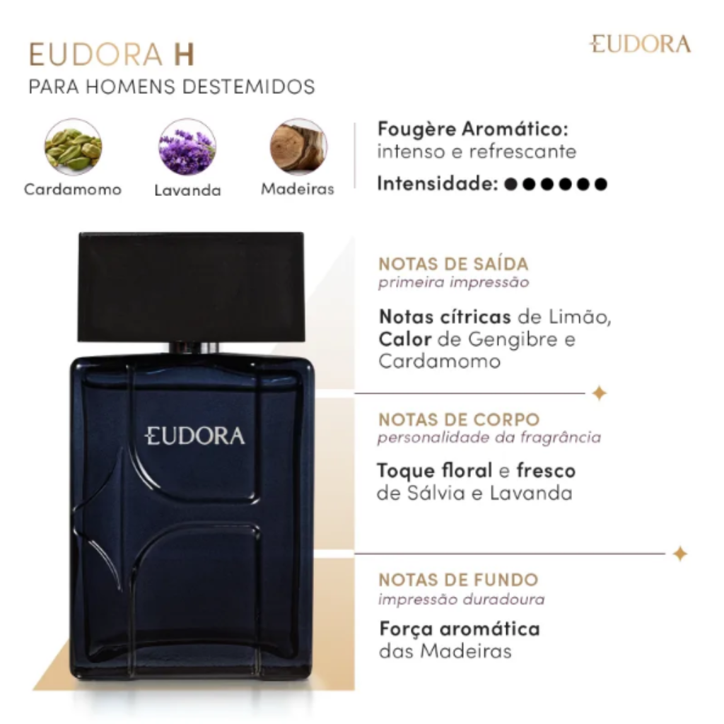 Eudora H é a marca que provoca você a viver o novo. Suas fragrâncias Fougère combinam notas frescas e potentes com ingredientes inusitados. O contraste perfeito para quem ama frescor com personalidade. Moderna e sofisticada, suas embalagens trazem o icônico "H" esculpido no frasco de vidro, criando um aspecto imponente e multifacetado, que traduz a personalidade marcante e exclusiva de Eudora H.
