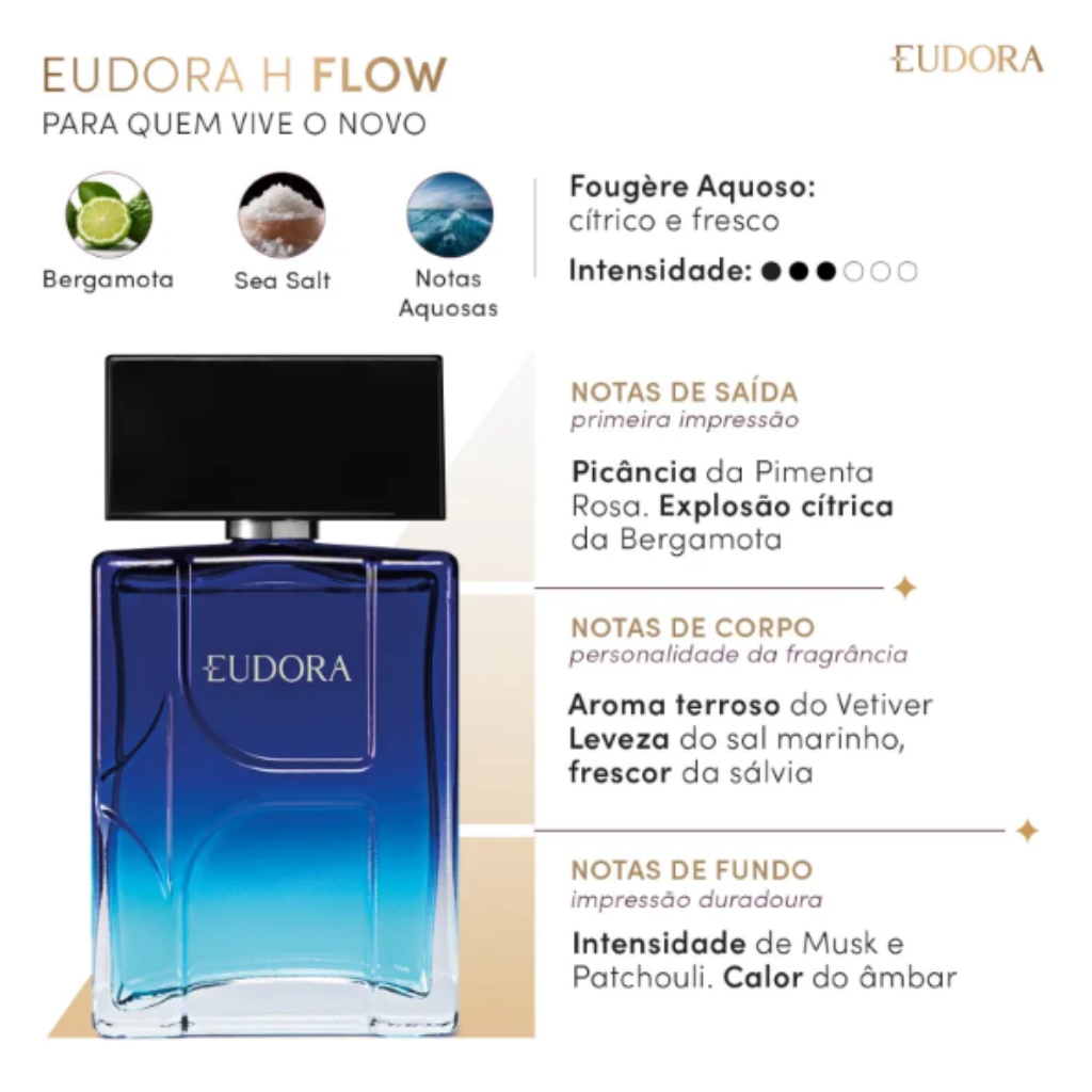 A fragrância de Eudora H Flow possui uma explosão inicial de bergamota, com o exclusivo acorde Sea Salt: uma fusão das notas minerais de sal marinho com o aromático alecrim, que combinado às notas aquosas trazem um frescor intensificado. Por fim, patchouli, musk e âmbar trazem contraste e conforto para a fragrância.