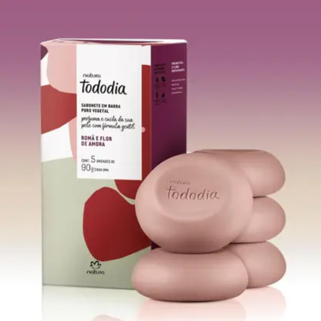 Limpa sem ressecar e perfuma a pele com a fragrância envolvente de Romã e Flor de Amora.Viva um banho cheio de sentidos com o Sabonete em Barra Puro Vegetal Tododia Romã e Flor de Amora. Sua fórmula gentil envolve uma cuidadosa combinação de ingredientes de origem natural que mantém a hidratação da sua pele e a deixa perfumada. Benefícios • Limpeza profunda, sem ressecar. • Pele protegida e perfumada. • Textura cremosa e deliciosas nuvens de espuma perfumada. • Fragrância marcante e envolvente com notas adocicadas frutais inspirada em romã e flor de amora. • Rende muitos banhos para mais momentos de autocuidado. Dicas de uso Para um banho revigorante, deslize o Sabonete em Barra Puro Vegetal Tododia Romã e Flor de Amora por todo o corpo, exceto no rosto. Enxágue em seguida e aproveite a sensação de maciez. Sua pele está limpinha e preparada para receber seu Creme Desodorante Nutritivo para o Corpo Tododia.
